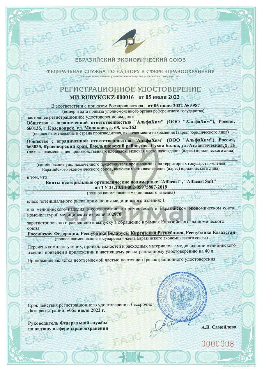 Alfacast® – современная альтернатива гипсовой повязке. Предназначен для изготовления фиксирующих повязок при иммобилизации переломов, вывихов, травмированных суставов, поврежденных связок опорно-двигательного аппарата, при ортопедических заболеваниях и после травматолого-ортопедических операций. Применяется в качестве иммобилизирующего и ортезирующего средства.